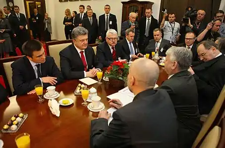 Президент Петро Порошенко провів зустрічі з Президентом Польщі Броніславом Коморовським, Маршалком Сенату Польщі Богданом Борусевичем, Маршалком Сейму Польщі Радославом Сікорським, Головою Ради Міністрів Польщі Евою Копач, виступ на спільному засіданні Сейму та Сенату Республіки Польща.[31][32] |