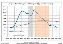 Динаміка населення з 1875 року в сучасних кордонах (Синя лінія: населення; Пунктир: відносна порівняльна динаміка населення землі Бранденбург; Сірий фон: період Третього рейху; Помаранчевий фон: період НДР)