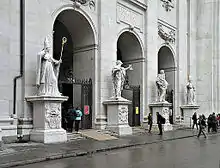 Вхід у собор закривають троє масивних бронзових дверей, які символізують Віру (ліві двері), Любов (середні) та Надію (праві), роботи Тоні Шнайдер-Манзеля, Джакомо Манцу і Евальда Матаре (1957-58).
