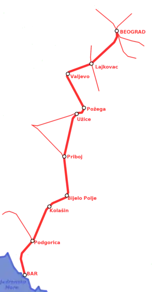 Залізниця Белград—Бар має стандартну ширину колії, завдовжки 476 км. З них 301 км залізниці прямує Сербією і 175 км Чорногорією. Повністю електрифікована (25 кВ, 50 Гц змінного струму). На шляху має 254 тунелі загальною довжиною 114 435 м та 435 мости (загальна довжина 14 593 м). Найдовші тунелі — Созіна — 6.17 км та Златибор — 6.139 км (4 мили). Найбільший і найвідоміший міст — віадук Мала Рієка, завдовжки 498 м (1634 фута) та кліренсом 198 м.