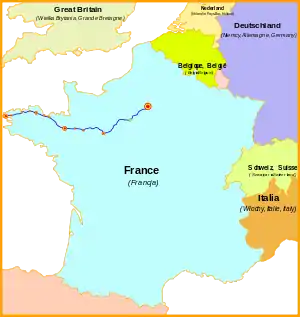 За Вітре вона проходить вздовж річки Вілен до Ренна. Потім прямує на північний захід до Ламбаль, де повертає на захід. Біля Сен-Бріє (у Іффіньяку) вона доходить до узбережжя Ла-Манш, далі на захід через Генгам і Морле до Бреста.