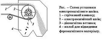 Електромагнітний шків типу ШЕ встановлюється як привідний барабан стрічкового конвеєра, що транспортує рядове вугілля (рис.). Потік матеріалу, що переміщується стрічковим конвеєром 1, при надхо-дженні його до місця розвантаження потрапляє у магнітне поле, яке створюється електромагнітним шківом 2. Залізні і стальні предмети, які володіють магнітною сприйнятливістю, притягуються до поверхні стрічки, виносяться під барабан і розвантажуються на виході стрічки на пряму ділянку у окремій жолоб 4. В зоні відділення феромагнітних предметів від стрічки в електромагнітній системи передбачена діамагнітна вставка 3, яка полегшує відрив цих предметів. Ефективність відділення феромагнітних предметів залежить від їхньої магнітній сприйнятливості, форми і маси, а також від фізичних властивостей матеріалу (густини, вологості, крупності), що транспортується. Залежно від товщини шару матеріалу на стрічці на фабриках використовують електромагнітні шківи п’яти типорозмірів: ШЕ-65-63В, ШЕ-80-80В, ШЕ-100-80В, ШЕ-120-100В, ШЕ-140-100В.