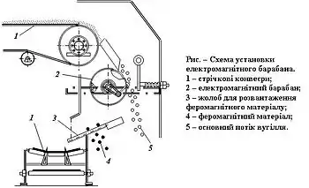Для більшої ефективності вилучення феромагнітних предметів з нижніх шарів транспортованого вугілля, в робочій зоні залізовідділювача встановлюють спеціальні роликоопори, які струшують стрічку.