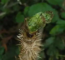 Має товсте довге горизонтальне кореневище, розміщене близько від поверхні ґрунту. Стебла прямі, малорозгалужені, вкриті голчастими колючками. Листки чергові, довгочерешкові, великі, 5— 7-лопатеві, по краю — двозубчасті й колючі, розміщені на бічних пагонах; на вегетативних пагонах їх по 1—4, на генеративних — по 5. Квітки дрібні, двостатеві, зеленаві, в невеликих простих зонтиках, що утворюють поникле рідке суцвіття.
