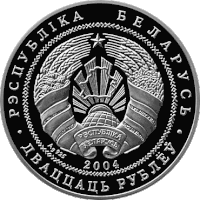 - Аверс: у колі, з геометричним орнаментом, — зображення державного герба Білорусі, унизу розміщено рік карбування, для срібла — чиста вага і проба дорогоцінного металу; по колу написи: вгорі — «РЭСПУБЛІКА БЕЛАРУСЬ», вниз — «ДВАЦЦАЦЬ РУБЛЁЎ» на срібній і «АД3ІН РУБЕЛЬ» — на мідно-нікелевій.