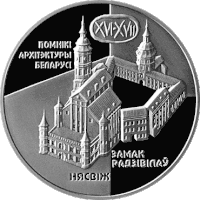 - Реверс: у центрі — зображення Замку Радзивіллів; вгорі — напис у три рядки: «ПОМНІКІ АРХІТЭКТУРЫ БЕЛАРУСІ» і у вигляді стародавньої друку поміщена дата: ХVI–XVII; унизу написи: «НЯСВІЖ», «ЗАМАК РАДЗІВІЛАЎ».
