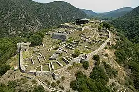 Перші укріплення навколо поселення, які включали п'ятигранну цитадель і стіну, що охоплювала південно-західну частині пагорба, дві брами на західній та південній частинах, датовані IV століттям. За імператора Юстиніана мури на південній стороні посилюються напівкруглою баштою, а також розбудовуються у висоту, будується сховище для води в середині цитаделі. В X столітті коли поселення стало єпискоством по кутах мурів та інших вразливих ділянках замку добудовано оборонні вежі, а зі східнї сторони вздовж скель побудований новий оборонний мур. Проте вже в XII столітті вежа зі східної сторони була зруйнована та занедбана як і частина східної стіни[1][2].
