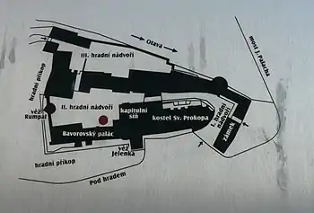 Невеликий I двір замку розташований в східній частині замкового комплексу і утвореними будівлями колишньої резиденції великого пріора (зі сходу), костелу святого Прокопа (із заходу) і колишньої замкової пивоварні (з півночі). На південній стороні II замкового двору розташовані будівлі конвенту з Капітульною залою і Баворським палацом, із заходу двір обгороджений фортечною стіною з вежею Румпаль, а з півночі обмежений будівлями музею середнього Поотав'я (чеськ. Muzeum středního Pootaví). У південно-західній частині II двору — вхід у ресторан «Замковий льох» (чеськ. Hradní sklípek), а перед входом до музею — замковий колодязь. У північній стороні двору — вхід у III замковий двір. У III дворі розміщено дитяче відділення Шмідінгерскої бібліотеки. З цього двору через західні ворота можна потрапити в замковий рів, де є міні-зоопарк і далі — замковий сад.