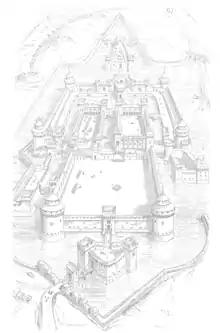 У 1550 році під керівництвом Вінченцо Серені розпочалися роботи по укріпленню фортифікацій. Було створено новий оборонний мур п'ятикутної форми (потім змінений на 6-кутний). Зовнішні мури досягли загальної довжини 3 км[5] і займали площу в 26 га[6]. Античні зали з фресками були перетворені на столярні майстурні та комори, в дворах були побудовані цегляні курники. На початку сімнадцятого століття були створені рови, що відокремили замок від міста.