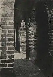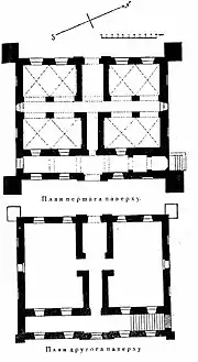 На першому поверсі, який призначався для службових приміщень, чотири мали однакові за розміром прямокутні у плані помешкання, відокремлені один від одного взаємно перпендикулярними коридорами. Споруди сполучалися з бічними коридорами широкими арками. Кожна кімната була перекрите парою хрестових склепінь, а коридори циліндричними. На верхньому поверсі були дві великі кімнати.