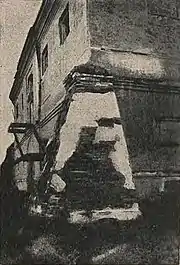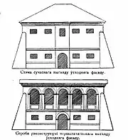 Мурована двоповерхова прямокутна будівля розміром 21×14 м була накрита вальмовим дахом. Кути посилені потужними контрфорсами, які сягали висоти середини другого поверху. В елементах фасадів використана ренесансна ордерна пластика.