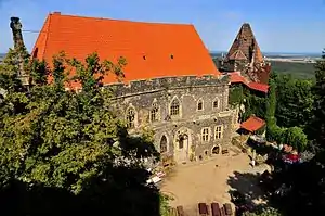 Перший і другий поверхи виконували житлові функції, про що свідчать віконні отвори, раніше оздоблені вітражами. У північній частині другого поверху міститься каплиця, а поруч з нею — «Лицарська зала» (найбільш репрезентаційна зала у замку). З цієї зали готичні портали провадять до сусідніх кімнат. У них раніше були кімнати княгині та її двору. Найвищий рівень палацу займає порожня оборонна галерея[5].