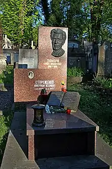 Пам’ятник з бронзовим горельєфом височіє на могилі Євгена Замори, похованого на Личаківському цвинтарі у Львові.
