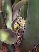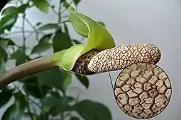 Квітконоси нечисленні (1—2 штуки), виходять із бульби. Вони такі само товсті, як і черешки листків, але значно коротші і пониклі. Суцвіття — початок завдовжки 5—7 см, складений з багатьох дрібних квіток білого, рожевого або кремового кольору. Покривало суцвіття зеленкувато-білого кольору. У фазі бутонізації воно охоплює суцвіття гострим конусом, на початку цвітіння оточує початок на кшталт вушка, наприкінці цвітіння відгинається і поникає. Початок при відцвітанні буріє. Квітки одностатеві, дуже дрібні, з чотирма призматичними пелюстками. Тичинкові квітки мають по чотири тичинки, коротші за пелюстки, з вільними, довгими тонкими тичинковими нитками. Маточкові квітки містять яйцеподібну маточку з двогніздою зав'яззю. Плід — одно- або двонасінна ягода[6].