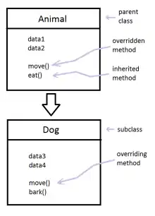 Клас Thought (Думка) є суперкласом і реалізує метод названий message(). Підклас з назвою Advice (Порада) успадковує методи, що є у класі Thought. Проте, клас Advice заміщує метод message(), змінивши те, що він робить.