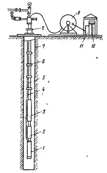 Установка зануреного електропривідного відцентрового насоса (рис. ) складається із заглибного агрегату, що включає спеціальний заглибний маслозаповнений електродвигун 1, протектор гідравлічного захисту із газовим сепаратором 2, відцентровий багатоступінчастий насос 3, броньований кабель живлення 4, який кріпиться до колони НКТ 5 хомутами 6. За допомогою гирлового устаткування 8, установленого на колонній головці експлуатаційної колони 7, за допомогою перевідників підвішена колона насосно-компресорних труб 5. На поверхні поряд зі свердловиною встановлюється кабельний барабан 9 і автотрансформатор 10 зі станцією керування 11. На кабельному барабані 9 передбачений запас кабелю для збільшення глибини спуску заглибного агрегату, а під час підземного ремонту на нього намотується кабель, спущений у свердловину. Вище від насоса встановлюється зворотний клапан, що полегшує пуск установки після її простою, а над зворотним клапаном – спусковий клапан для зливання рідини з внутрішньої порожнини НКТ при їхньому підйомі.