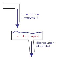 Наприклад, номінальний валовий внутрішній продукт України стосується загальної кількості гривень, витрачених за певний проміжок часу, наприклад, рік. Таким чином, це є змінною потоку і має одиницю виміру гривень / рік. Навпаки, номінальний основний капітал України — це загальна вартість у гривнях обладнання, будівель та інших реальних виробничих фондів економіки України та має одиницю виміру — гривні. Діаграма дає підсвідомий показ того, як наявний в даний час запас капіталу, збільшується за рахунок припливу нових інвестицій та виснажується потоком амортизації.