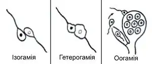 - оогамія — одна з гамет (яйцеклітина) значно більша від другої, нерухома, ділення мейозу, що призводять до її утворення, різко асиметричні (замість чотирьох клітин формується одна яйцеклітина і два абортивних «полярних тільця»); інша (спермій, або сперматозоїд) рухлива, зазвичай жгутикова або амебоїдна.