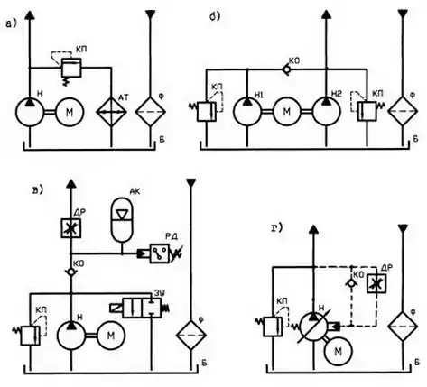 Гідросистеми насосних установок гідроприводу: однонасосної з переливним клапаном (а), двонасосної з двома переливними клапанами (б), насосно-акумуляторної (в) та з авторегульованим насосом (г)