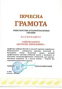 В 2005 році отримав почесну грамоту від міністра аграрної політики України за плідну працю у Національному університеті харчових технологій.