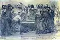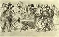 ![]() | Типовий бурсак, підстрижений під макітру і що не встиг ще відростити вуса, — художник Порфирій Денисович Мартинович. Навчався в Академії мистецтв, володів філігранною графікою, але через хворобу в 25 років був вимушений залишити живопис. Рєпін ніколи його не бачив вживу, тому персонажа він писав не з живого Мартиновича, а з гіпсової маски, знятої з лиця молодого художника. Коли з нього знімали маску, той усміхнувся, і усмішка так і залишилася на масці. Так її Рєпін і змалював. |
