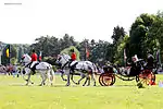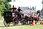 Лівий кінь під сідлом з форейтором, без машталіра. Звичайний у Королеви Великої Британії, але з 3 парами коней. |