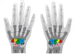 | Назва | Проксимальні/променеві зчленування | Латеральні/медіальні зчленування | Дистальні/п'ясткові зчленування |
