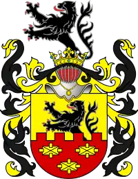 Жовте поле щита розділено на дві половини горизонтальною лінією. На верхній половини зображений розвернений у правий бік лев, що виходить з мурів фортеці, які розташовані в нижній половині щита. На червоних мурах фортеці зображені три золотих камені. Над короною також зображений лев.