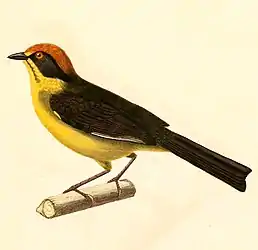 Довжина птаха становить 16-17 см. Верхня частина тіла, крила і хвіст чорні. Бічні сторони голови чорні, на лобі і тімені широка руда смуга. від дзьоба ідуть жовті смуги, схожі на вуса. Горло і плечі жовті, нижня частина тіла жовта. Гузка оливкова. Виду не притаманний статевий диморфізм. Верхня частина тіла молодих птахів має коричнюватий відтінок, на нижній частині тіла можуть бути коричнюваті смужки. Представники підвиду A. r. carrikeri меншого розміру, верхня частина тіла в них має оливково-зелений відтінок, смуга на голові темно-руда з коричнюватим відтінком. Виду не притаманний статевий диморфізм.
