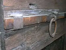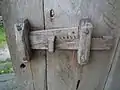 - Клямка (від сер-в.-нім. klamm, пор. «клема»)[8] — запірний пристрій у вигляді пластинки з важільцем, яка на відміну від засува закріплена одним кінцем на осі й може підійматися й опускатися[9].