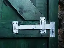 - Шпінгале́т (через рос. шпингалет і нім. Spaniolett від фр. espagnolette — «запірна ручка для вікон», букв. — «іспаночка»)[11] — засувка у вигляді металевого стрижня чи пластинки з боковим важільцем[12]. Використовується для запирання хвірток, стулок вікон, кватирок.