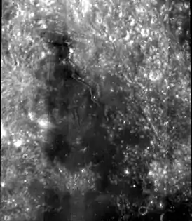 - Західна частина π-подібної системи борозен. Розділення — 0,49 м/пікс, ширина — 2,5 км. Нормально орієнтоване зображення.