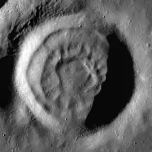 Безіменний концентричний кратер біля західного краю затоки (розмір — 8×6,5 км)