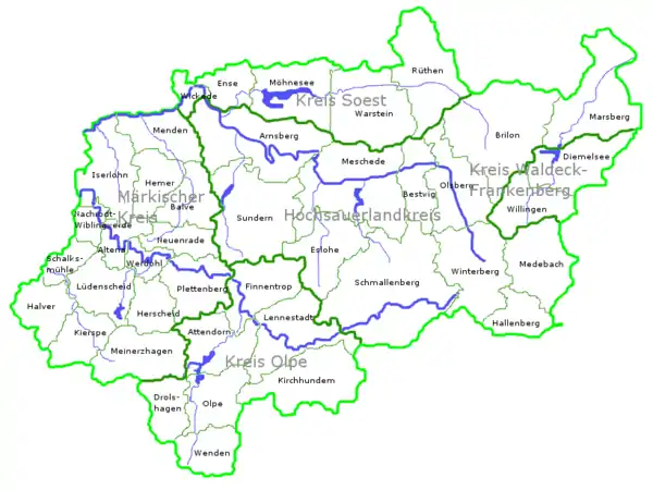 У регіоні знаходяться кілька великих озер-водосховищ, створених після 1899 року за рахунок будівництва гребель на місцевих річках. Найзначніші серед них: Біггерзее, Мьонезее, Зорпезее та Хеннезее.