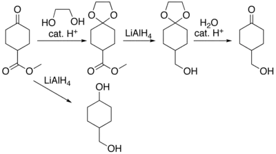 Приклад: алюмогідрид літію може відновлювати естерну та карбонільну функціональні групи одночасно. Однак, якщо потрібно провести реакцію лише з естерною групою і залишити недоторканою карбонільну, то останню захищають, перетворюючи її у кеталь, який з алюмогідридом не реагує