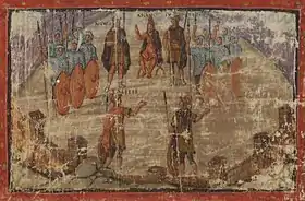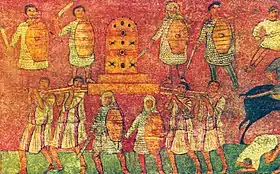 На фресці з синагоги у Дура-Европос, збудованої у 244—245 рр., на якій зображена битва між євреями та філістимлянами при Евен-Гаезері (описана у Першій книзі Самуїлової), серед інших фігур можна побачити шістьох вояків у обладунках, у тому числі трьох у капюшонах. Пітер Коннолі вважає ці капюшони лускатими[3], Бішоп і Коулстон — лускатими або кольчужними[4], Грем Самнер — лускатими[5], хоча визнає, що оригінальне зображення можна інтерпретувати і як кольчужні капюшони[6]. У 256 році Дура-Европос була захоплена та зруйнована персами-сасанідами, після чого була заброшена і вже не відбудовувалась. Таким чином, це дозволяє точно датувати знайдені зображення.