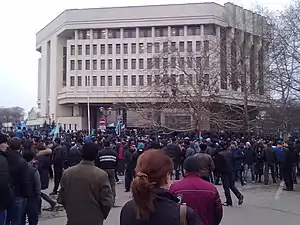 26 лютого під стінами Верховної Ради АРК паралельно відбулися 2 акції: проукраїнський мітинг, організований Меджлісом кримськотатарського народу, котрий зібрав 10-15[4] тисяч учасників, та проросійський чисельністю близько 700 осіб[5], ініціатором якого стала партія «Руська єдність». Через незадовільні заходи безпеки, вжиті правоохоронцями, між проукраїнськими та проросійськими учасниками мітингів сталися сутички, у результаті чого загинули 2 учасників проросійського мітингу[4]. Проросійський мітинг був відтіснений до внутрішнього двору кримської Верховної Ради, а призначена днем раніше сесія парламенту була скасована[6].