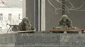 ![]() Кулеметники без знаків розрізнення на позиціях під будівлею Верховної Ради АРК Кулеметники без знаків розрізнення на позиціях під будівлею Верховної Ради АРК | |||||||