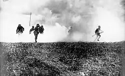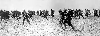 ![]() За годинниковою стрілкою з лівого верхнього кута: Королівська ірландська піхота, зосереджена в траншеї, битва на Соммі, літо 1916; британський солдат виносить пораненого товариша з поля бою[Прим. 3], битва на Соммі, 1 липня 1916; молодий німецький солдат, озброєний гвинтівкою 98a-Gewehr; американська піхота штурмує німецький бункер; німецький важкий бомбардувальник Gotha G.IV; американські танки Рено FT-17 висуваються по Аргоннському лісу на передову[Прим. 4]. 26 вересня 1918 За годинниковою стрілкою з лівого верхнього кута: Королівська ірландська піхота, зосереджена в траншеї, битва на Соммі, літо 1916; британський солдат виносить пораненого товариша з поля бою[Прим. 5], битва на Соммі, 1 липня 1916; молодий німецький солдат, озброєний гвинтівкою 98a-Gewehr; американська піхота штурмує німецький бункер; німецький важкий бомбардувальник Gotha G.IV; американські танки Рено FT-17 висуваються по Аргоннському лісу на передову[Прим. 6]. 26 вересня 1918 | |||||||