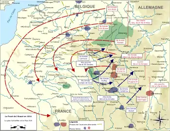 Чинний на літо 1914 року французький план № 17 із самого початку війни мав чітко виражений наступальний характер. Головнокомандувач французькими арміями прагнув, «зібравши усі сили, кинути їх у наступ проти німецьких армій»[26]. Стратегічним задумом, закладеним в оперативну частину плану, передбачалося проведення «двох головних операцій, що розвиваються: одна праворуч — у районі між лісовими масивами Вогезів і річкою Мозель, нижче Туля, друга лівіше — на північ від лінії Верден — Мец»[23].