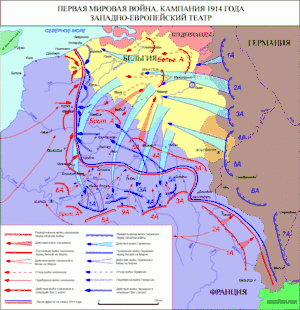 У ніч на 4 серпня німецькі частини у складі шести посилених бригад, одного піхотного полку і трьох кавалерійських дивізій[Прим. 10] без оголошення війни перетнули бельгійський кордон і вирушили до фортеці Льєж, що прикривала переправи через річку Маас[Прим. 11][41]. До вечора 5 серпня німецькі частини підійшли до лінії фортів Льєжа, намагаючись раптовою атакою з ходу опанувати фортецю. Однак перші атаки, спрямовані в проміжки між фортами, були відбиті бельгійцями[42].