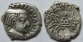 | Віджаясена | vijayasenasa | 238-251 | 160 / 172 (238 / 250) | ![]() | Цар Магакшатрап Віджаясена, син Царя Магакшатрапа Дамасени (rajno mahakshatrapasa damasenasaputrasa rajno mahakshatrapasa vijayasenasaт). Перші емісії 160—161 рр. Е. С. з титулом Кшатрапа. З емісіями цього династа пов'язані т.з. «Бомбейські підробки» — маловивчені монети меншої якості та ваги, поширені в регіоні Бомбею та Агмадабаду. Відомий напис цього царя, датований 162 р. Е. С. | |