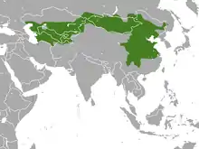 Країни проживання: Афганістан, Китай (Аньхой, Пекін, Ганьсу, Гуйчжоу, Хебей, Хейлунцзян, Хенань, Хубей, Хунань, Цзянсу, Цзянсі, Цзілінь, Ляонін, Nei Mongol, Нінся, Цинхай, Шеньсі, Шаньдун, Шаньсі, Сичуань, Синьцзян, Юньнань); Іран, Казахстан, Киргизстан, Монголія, Росія, Туркменістан, Узбекистан. Мешкає в напівпустелях, степу, кам'янистих місцях проживання, і лісових галявинах. Цей вид має ареал, проте, як правило, від 600 до 900 метрів над рівнем моря.