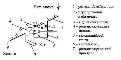 Для розділення за формою і парусністю застосовують площинний сепаратор (Рис. 2), який забезпечений розгінним майданчиком 1, відбивним виступом 3, розвантажувальною щілиною 4. Особливість сепаратора — наявність перфорованого майданчика 2 перед відбивним виступом. Через перфорацію продувається повітря, яке перекидає частинки слюди через відбивний виступ. Селективність розділення посилюється завдяки високій парусності плоских частинок слюди.