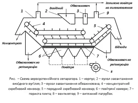 Схема дослідно-промислового зразка аеросуспензійного сепаратора СВС-100 наведена на рис. Сепаратор складається з корпуса 1, в нижній частині якого роз-міщена пориста плита 7. Ця плита (технічна повсть, пориста кераміка) служить для забезпечення рівномірного розташування повітряного потоку на елементарні струминки (цівочки) з мінімальним перетином і створення однорідної аеросуспензії. Під пористу плиту 7 через повітряні камери 6 вентилятором 8 подається повітря, яке при проходженні крізь шар обважнювача, що подається в сепаратор пристроєм 3, зважує його і створює аеросуспензію. Вихідне вугілля спеціальним живильником 2 подається на поверхню суспензії, де воно розділяється на легкий продукт (концентрат), що видаляється скребковим конвеєром 4, і важкий продукт, що видаляється скребковим конвеєром 5. Обважнювач відділяється від продуктів збагачення на бокових ситах і направляється на реґенерацію. Спосіб реґенерації обважнювача вибирається залежно від його фізичних і властивостей характеристики збагачуваного вугілля. Для реґенерації обважнювача можна використовувати магнітну і електричну сепарацію.