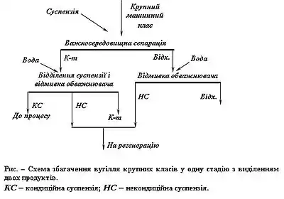 Важкосередовищну сепарацію використовують для збагачення крупних класів вугілля, антрацитів дуже важкої, важкої і середньої збагачуваності, усіх категорій збагачуваності при вмісті класу +13 мм у гірничій масі понад 20 %, а також для вугілля легкої збагачуваності при вмісті породних фракцій понад 30 %. Технологічні схеми збагачення крупних машинних класів вугіл-ля в магнетитовій суспензії поділяють за кількістю стадій збагачення, кінцевих продуктів і призначенням.