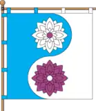 Квадратне полотнище поділене вертикально вигнуто у формі оберненої літери «S» на синю древкову і білу вільну частини. В центрі полотнища одна під одною дві водяні лілеї: на синій частині біла з пурпуровою серединкою, на білій пурпурова з білою серединкою.