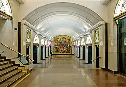 Над ескалаторами розташоване мозаїчне панно, що зображує бій Семенівського полку.