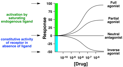 Нейтральний антагоніст не має ніякої активності за відсутності агоніста або зворотного агоніста, але може блокувати активність будь-якого з них.[1] Зворотні агоністи мають дії протилежні агоністам, але ефекти обох з них можуть блокуватися антагоністами.[2]