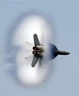 Швидка конденсація водяної пари внаслідок звукового удару при переході на надзвукову швидкість створює конус з пари (також відомий як Ефект Прандтля — Глоерта), який видно неозброєним оком.